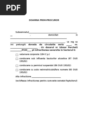 Rtf, pdf, txt or read online from scribd. Prin cererea inregistrata pe rolul curtii de apel ploiesti la data de 17.10.2014, petentul ra a solicitat prelungirea dreptului de circulatie pe drumurile publice. La cererea formulata, petentul a atasat copia cartii de identitate si copia dovezii seria cu nr.0726006 din 18.09.2014 eliberata de ipj dambovita.